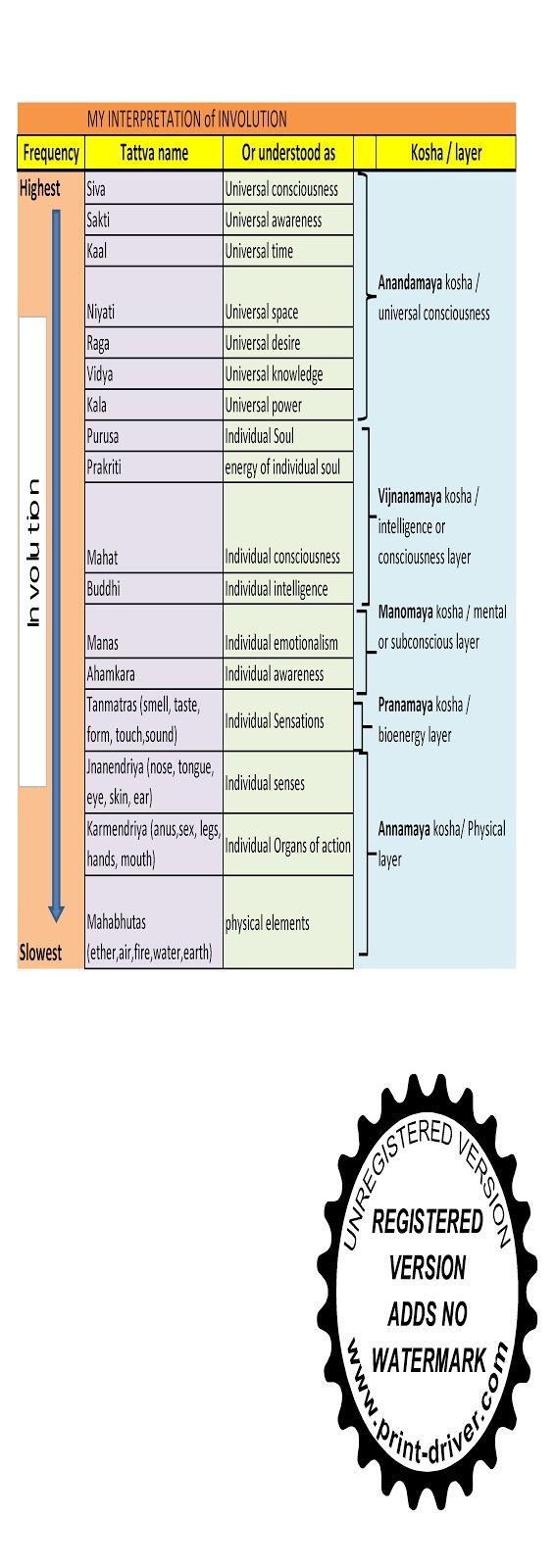 Each of these layers is a part of the complete electromagnetic energy spectrum with different frequencies. These are not watertight layers, but broad divisions of the complete energy range. There are many different school of thoughts that divide the energy spectrum in different manner. Some of the prevalent understandings are the three type of bodies (causal, subtle and gross or the thrity six tattvas or the five koshas. Please find a chart explaining the involution process, leading to human form:-